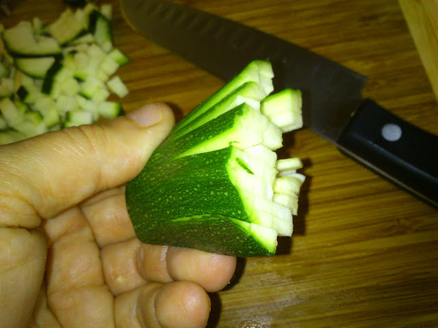 Mientras todo se va haciendo a fuego lento, cortamos los calabacines como en la foto (así tardaremos menos)
